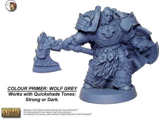 The Army Painter Wolf Grey – Colour Primer, zoals de naam al doet vermoeden lijkt Wolf Grey precies op Space Wolves Grey van GW, waardoor het een onmisbare grondverf is voor de Spacewolves. De blauw grijze kleur dekt perfect. Het fijne pigment maakt deze Colour Primer Wolf Grey – grijsblauwe kleur primer de perfecte grondverf voor alle schilderprojecten. De verf droogt snel en houdt ieder detail op het model in perfecte conditie. Voeg nog wat extra details toe met kleur aan de miniatuur en dip het daarna in Quickshade. De blauw grijze kleur van Wolf Grey zorgt dan al voor het meeste werk! Zoals hieronder in het filmpje ook met rood te zien is. Tip: De Darktone Quickshade werkt hier het beste bij!