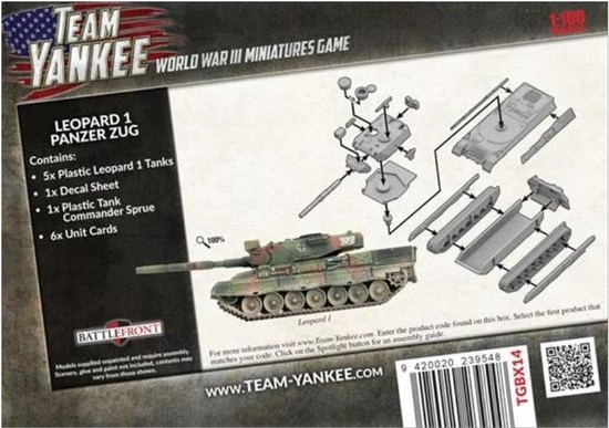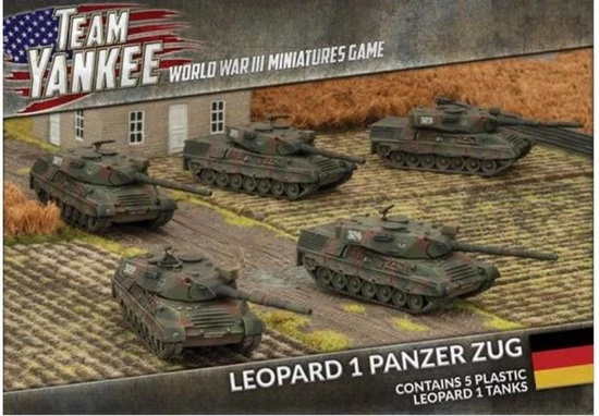 Includes five Leopard 1 plastic tanks, one plastic tank commander sprue, decal sheet & three Unit cards.