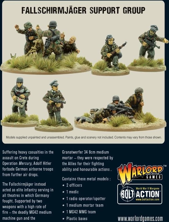 The Fallschirmjager instead acted as elite infantry serving in all theatres in which Germany fought. Supported by two weapons with a high rate of fire – the deadly MG42 general purpose machine gun and the Granatwerfer 34 8cm medium mortar – they were respected by the Allies for their fighting ability and honourable actions.