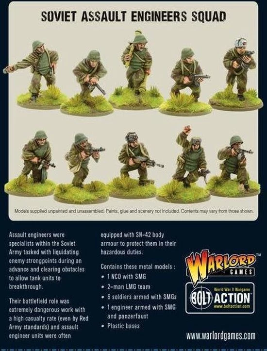Shortages meant that Soviet formations were sparsely served when it came to transport and rear-echelon support. Pioneer detachments were a notable exception. Their expertise was too essential to do without: bridge-building, demolitions, fortification construction and minefield placement and clearance. These all required skills the conscripted masses did not have. Assault engineers were specialists tasked with liquidating enemy strongpoints during an advance and clearing obstacles to allow tank units to breakthrough. This was extremely dangerous work with a high casualty rate (even by Red Army standards) and assault engineer units were sometimes equipped with SN-42 body armour to give them a fighting chance.