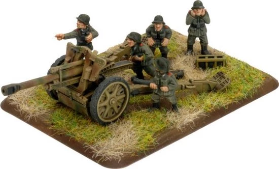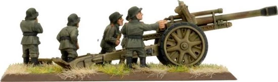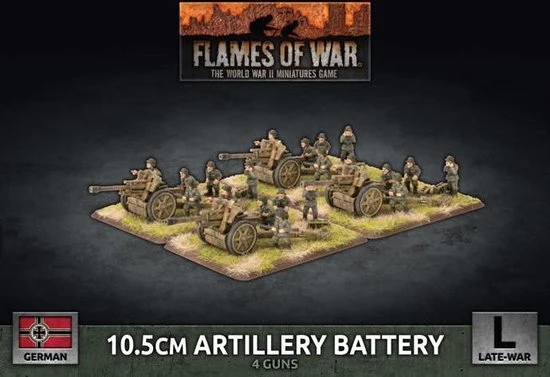 includes four Plastic 10.5cm howitzers, two Plastic Gun Crew Sprues, and two Unit cards.