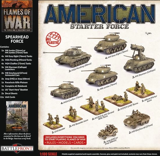 This All Plastic Army Deal contains: – 1x M4 Jumbo Tank – 4x M4 Easy Eight (76mm) Tanks – 2x M26 Pershing (90mm) Tanks – 4x M24 Chaffee (75mm) Tanks – 3x M4 Sherman with Calliope upgrade – 2x M8 Greyhound (37mm) Armoured Cars – 2x Jeep (MG) or Jeep (60mm) – 1x Parachute Rifle Platoon – 1x Complete A5 Rulebook – Decals and Unit Cards