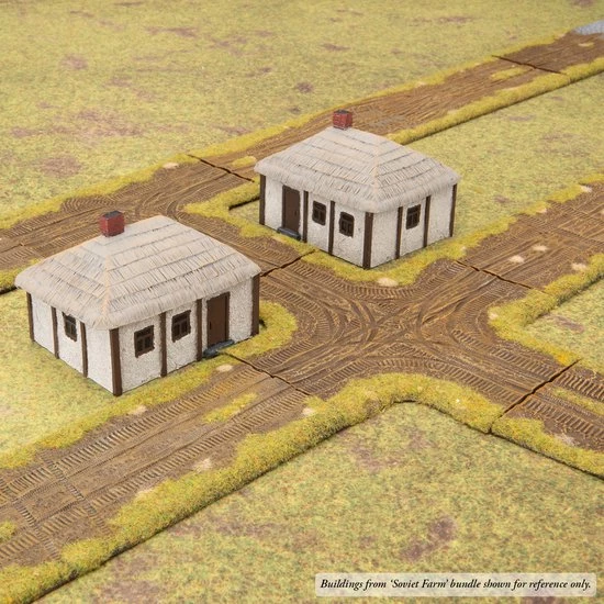 Bundle contains 13 pre-painted Rural Road and Rail sections. Buildings from Soviet Farm bundle shown for reference only. Road sections can be flocked as shown in the image using the GF9 range of scenics.