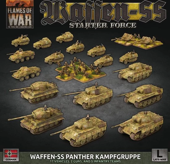 This All Plastic Army Deal contains: 5x Panther Tanks, 2x Tiger (8.8cm) Tanks, 1x SS Reconnaissance Platoon (with 5x Sd Kfz 250 Half-tracks), 2x Puma (5cm), 3x Sd Kfz 250 Scouts, 2x 8.8cm Anti-tank Guns, 1x Complete A5 Rulebook as well as Decals and Unit Cards