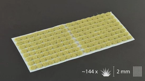 One plastic sheet of 14.5cm x 6.5cm full of Gamer’s Grass tufts. Tufts are 2mm tall.