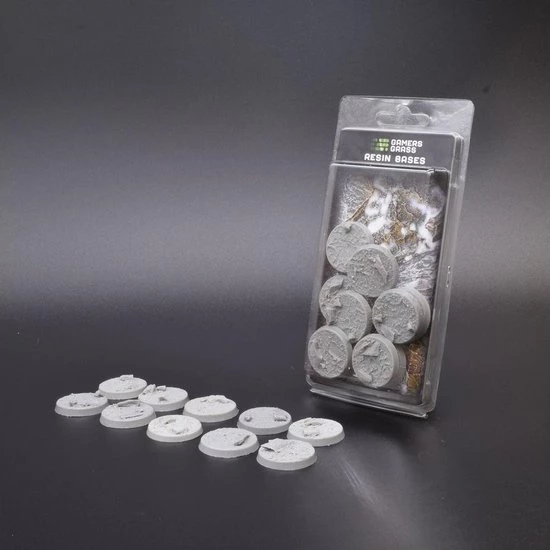 This pack contains 10 round resin bases 32mm wide in a rocky fields theme.
