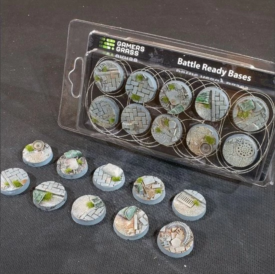 This pack contains 10 round Battle Ready Bases 25mm wide in a urban warfare theme.