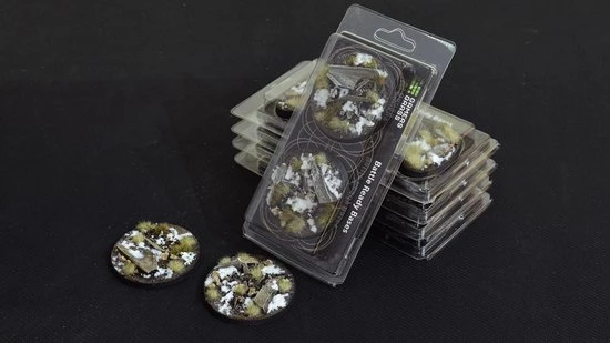 This pack contains 2 round Battle Ready Bases 60mm wide in a Winter theme.
