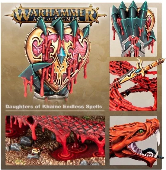 The Daughters of Khaine endless spells offer diverse and powerful tactical options to your army, designed to slay your foes and offer helpful boons to your own units. This set contains models for all two endless spells and an Invocation of Khaine, two of which can be cast by your wizards, while the third can be summoned by priestesses.
