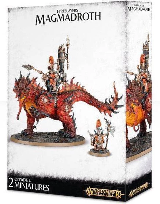 Deze box bevat een Citadel Fyreslayers Magmadroth model op een 120mm base. Het bevat onderdelen om de Magmadroth te modelleren met een Auric Runefather, Auric Runesmiter of Auric Runeson als ruiter. Bovendien bevat het onderdelen om een van de resterende twee modellen te voet te modelleren op een 32mm base. Al met al bevat het pakket onderdelen om een Magmadroth met ruiter en een model te voet samen te stellen.