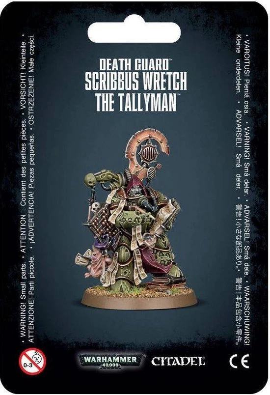 This multi-part plastic kit contains the parts necessary to assemble Scribbus Wretch, a Death Guard Tallyman. His is a particularly unpleasant model, even for Death Guard, with a morbid focus on gleefully counting and cataloguing misfortune he carries a massive ream of paper on a clipboard in the crook of his left arm, with a bone stylus in his right adding to his tallies. A strange apparatus hangs from his back, ending in a tentacle that grasps an abacus its beads, upon closer inspection, reveal themselves as skulls. His armour, as standard for the Death Guard, is covered in corrosion, boils and Nurgle icons, and he is accompanied by a Nurgling, busy with the task of carrying extra ink and paper. Scribbus Wretch stands atop a pile of books; likely written by him, and full of atrocities.
