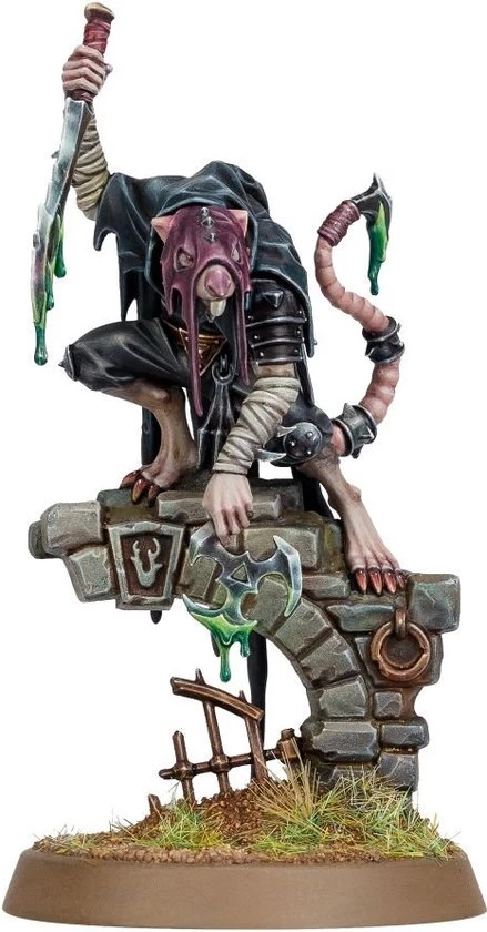This multipart plastic kit builds one Deathmaster, a peerless skaven assassin from the Clans Eshin. Draped in a sinister, ragged cloak and training wraps, climbing-claws stowed discreetly on a belt, this lethal saboteur lurks amongst their teeming ratfolk kin before leaping out to effortlessly murder enemy leaders. Weeping blades and jagged throwing stars dripping with warpstone toxins inflict wounds that can prove fatal with a single cut – whether wielded by a taloned paw or prehensile tail.