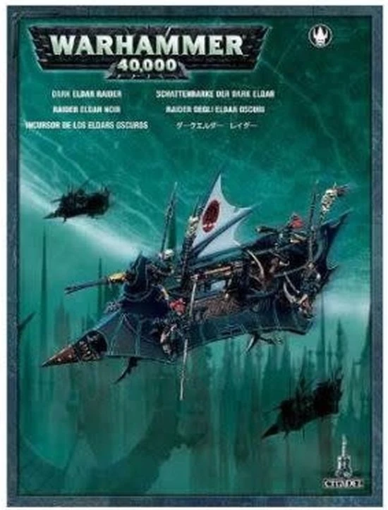 Raiders are the favoured transports of the Drukhari. Bladed skycraft, they are lightweight and extremely manoeuvrable. Raiders travel at extreme speed, using their sword-sharp fins and jagged keels to cut apart the foe, while their prow-mounted heavy weapons punish the foe.