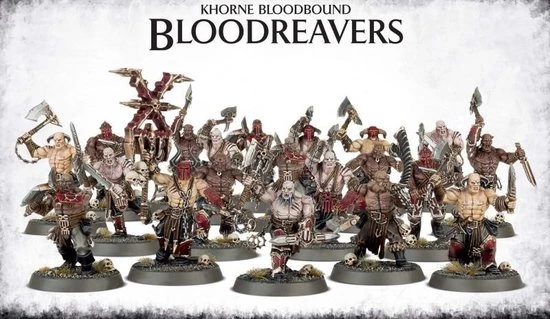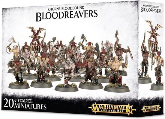 Deze box bevat 20 Citadel Khorne Bloodbound Bloodreavers met bijpassende 32mm bases. Drie van hen kunnen als Chieftain, Hornblower en Icon Bearer uitgerust worden.