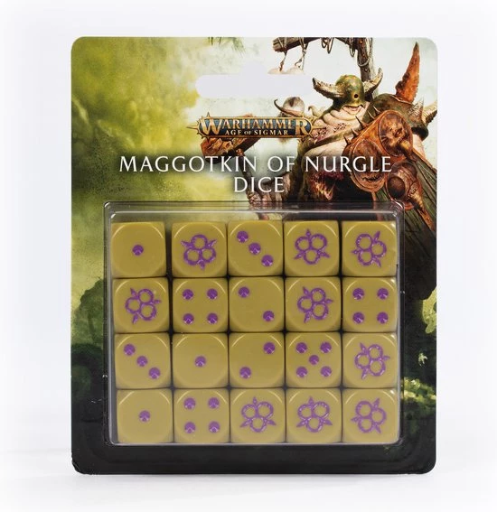 This set includes 20 six-sided, round-edged dice that measure 16mm along each edge. They are cast in a drab green colour with purple pips and an icon of Nurgle on the ‘6’ faces.