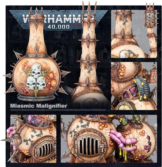 Festooned with swaying plague censers and tainted bells, Miasmic Malignifiers belch thick clouds of miasmal fumes from their rusted chimneys. Sown like spores across target worlds, they are parasites that suck filth from the ground and latch themselves on to local infrastructure, polluting the world on every level.