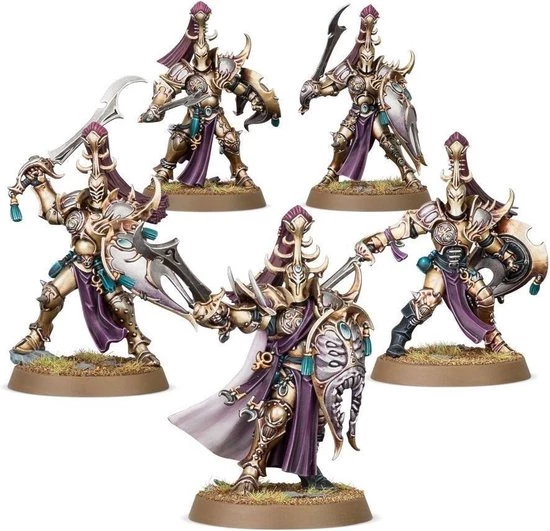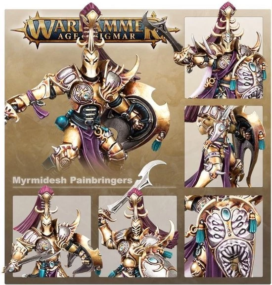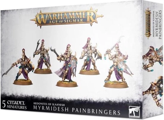 This 86-part plastic kit makes five Mymidesh Painbringers for use in Warhammer Age of Sigmar. It comes supplied with five 32mm Round Citadel bases. The kit can alternately be built as Symbaresh Twinsouls.