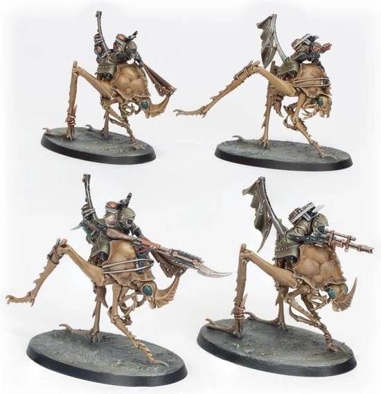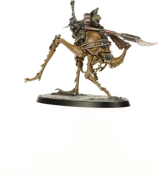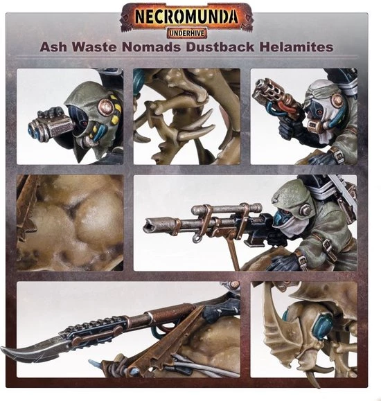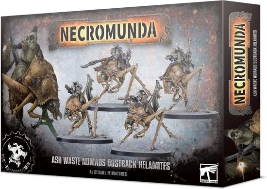 Ash Waste Nomads have inhabited the Great Equatorial Wastes for as long as anyone can remember. Unlike the outcasts and scavvies, these rugged survivors are born to the wastes, adapted to life in a desolate and deadly environment. Eschewing vehicles, which require fixed workshops and extensive maintenance, the Ash Waste Nomads instead tame the macro-insects that live in the wastes. Known as Dustback Helamites, these creatures can swiftly skitter across the shifting dunes, bearing skilled riders to provide loping speed and devastating hitting power on raids.