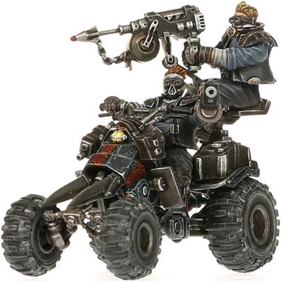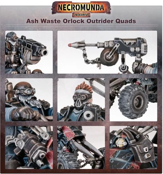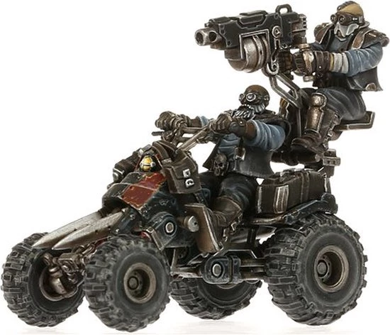 Ever practical, Orlock gangs employ light four-wheeled vehicles to navigate the harsh terrain of the ash wastes. These Outrider Quads pack serious firepower into a swift (and impressively loud) frame, offering support to the House of Iron whenever and wherever it?s needed. They also act as workhorses for the gang, toting the heavy equipment required for long treks across Necromunda’s deadly trade routes.