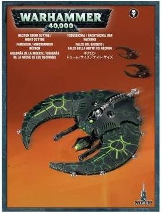 This multi-part plastic kit contains 51 components, a flying stem, large oval base and a Necron transfer sheet with which to build a Doom Scythe. This kit can be used optionally to build a Night Scythe.