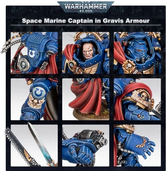 This kit is comprised of 25 plastic components, with which you can assemble 1 Space Marine Captain in Gravis Armour equipped with a chainsword, a power sword, or a powerfist, as well as a boltstorm gauntlet. It is supplied with a 40mm Citadel Round Base.
