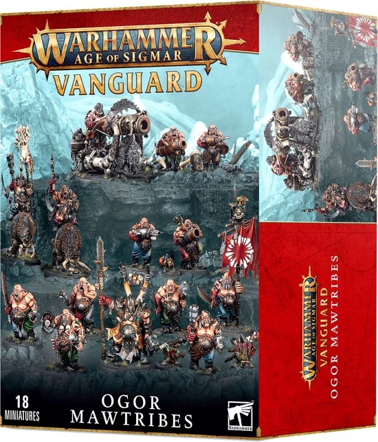 The Ogor Mawtribes are nomadic empires of brutish juggernauts that range across the lands, raiding and pillaging to appease their insatiable hunger. Iron-fisted Tyrants lead young and bullish Gluttons to war as gnoblar attendants scurry about their feet, supported by roaring blasts from the salvaged cannons of Leadbelchers and Ironblasters while Mournfang riders from the Beastclaw tribes savage the enemy flanks.