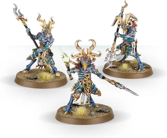 Elite Tzaangors, possessing strange feathers and elaborate horns, the Tzaangor Enlightened are truly blessed with the favour of Tzeentch. They wield ornate spears that set them above their lesser kin, some even riding upon Discs of Tzeentch. Tzaangor Enlightened can see strands of the past ? foes cower in superstitious fear as the Enlightened give voice to events from their lives that no-one ought to have knowledge of.
