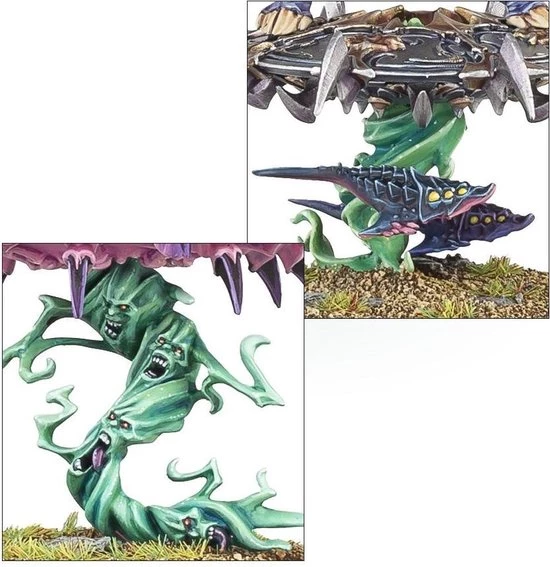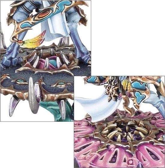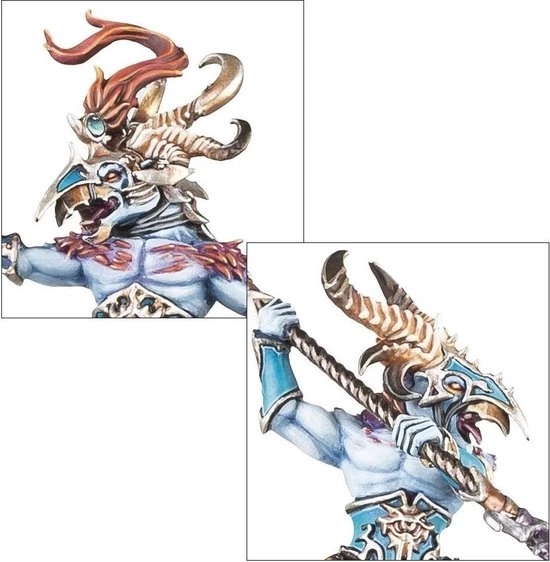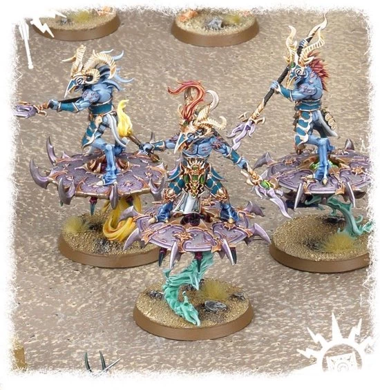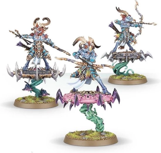 This multi-part plastic kit contains the parts necessary to assemble 3 Tzaangor Enlightened, armed with Tzeentchian spears. Each model can be assembled on foot, or riding one of the 3 included Discs of Tzeentch ? these are covered in sinister spikes and horns used to smash and hack apart unfortunate enemies, with a sculpted magical element attaching them to the base. One can be assembled as an Aviarch, featuring his own chest plate, bearing his own headpiece (from a choice of 2) and carrying a more ornate weapon befitting his elevated status. 6 different heads are included enablng you to customise your models.