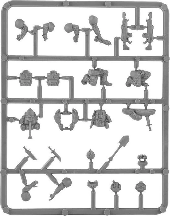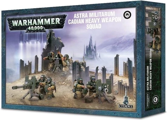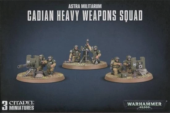 The set makes three Cadian Heavy Weapons Teams, each consisting of a gunner and a loader. Included are the options to equip these teams with any of the following weapons: lascannon, heavy bolter, missile launcher, autocannon or mortar.