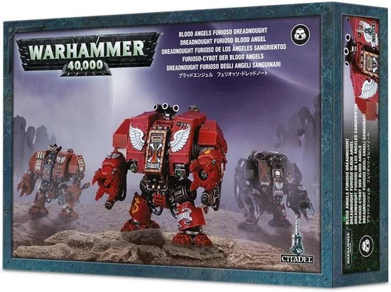 The Furioso Dreadnought is death incarnate, a towering war machine whose fearsome weaponry is guided by a pilot buried deep within its shell. Many bear the scars from thousands of years of warfare and they are revered within the Blood Angels Chapter as living relics. Some Furioso Dreadnoughts are guided by the crippled and ancient body of a Blood Angels Librarian, whilst others have succumbed to the Black Rage and now fight alongside the Death Company, intent on destruction and death.