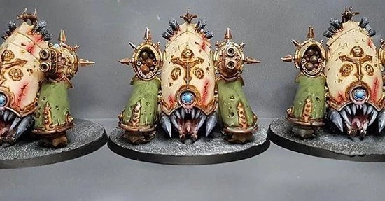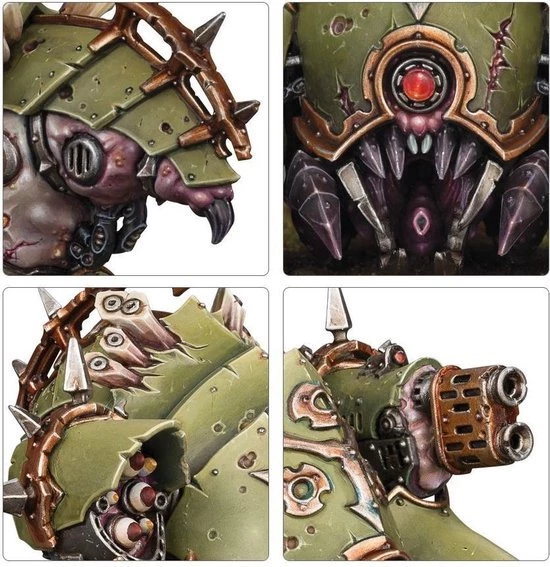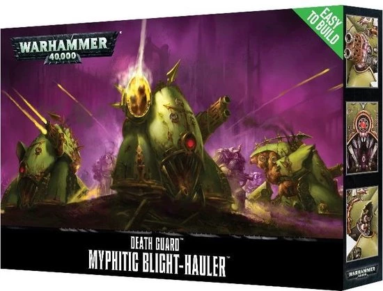 Powering into battle on a trio of articulated track units, the Myphitic Blight-hauler is a light Daemon Engine that provides the Death Guard with heavy firepower wherever it is needed. Resembling a Bloat-drone that has been stripped of its turbines, this strange machine has heavy weapons mounted on its carapace, and its rusting armoured plates can absorb impressive punishment ? as can its blubbery exposed flesh-parts, which soak up appalling trauma.