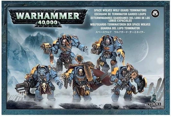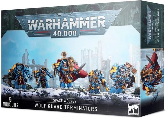 1 x Box SPACE WOLVES WOLF GUARD TERMINATORS5 figure plastic box set Stand-alone product, includes everything to build 5 complete Wolf Guard in Terminator armourIncludes 5 terminator helmets and 8 Space Wolf heads, all interchangeableIncludes storm bolters, assault cannon, heavy flamer, chainfists, power fists, power sword, frost axe, 4 sets of wolf claws and 4 sets of thunder hummer and storm shield
