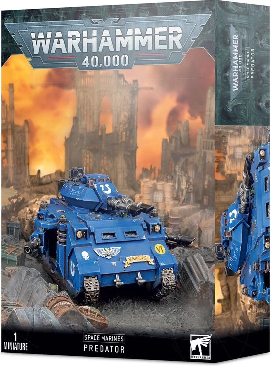 This box set contains one multi-part plastic Space Marine Predator tank. This 94-piece kit includes components to make all of the weapon options available in Codex: Space Marines, including: a twin-linked lascannon, a pair of lascannon sponsons, an autocannon, a pair of heavy bolter sponsons, a storm bolter and a hunter-killer missile.