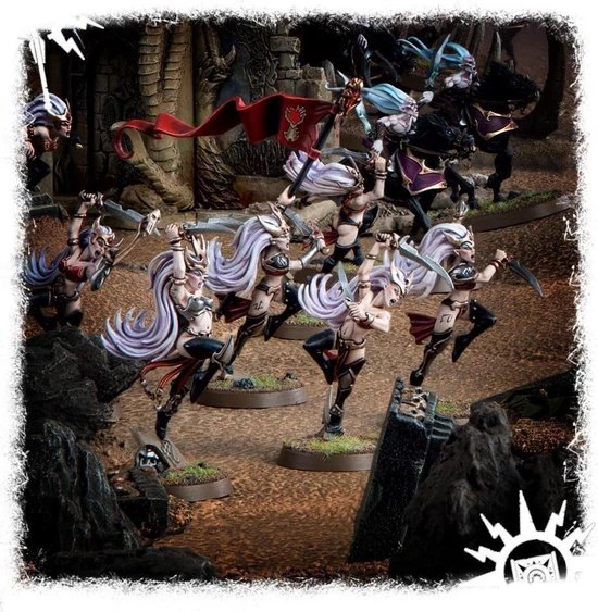 Devoted followers of Khaine, Witch Aelves spend their entire lives dedicated to serving their bloodthirsty deity. Weapons practice and mock duels take up the majority of their daily lives, yet these are not mere military drills, but religious services with all the gravitas other cults might use when offering prayers to their god. For Witch Aelves, ritual combat hones martial prowess and sates a craving for violence. On the battlefield, dancing like pale shadows, they weave a scarlet path through the orgy of destruction, revelling in the spray of jetting arteries.