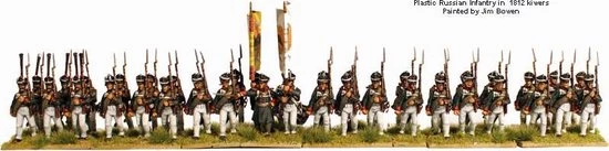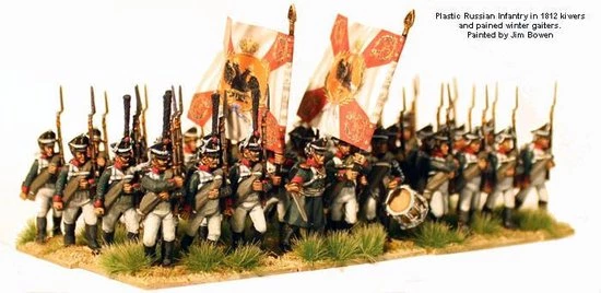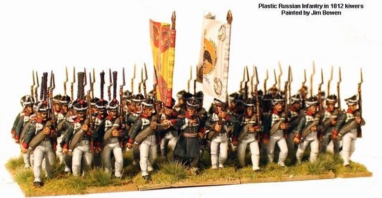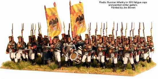 The figures in this box represent a battalion of a Russian Infantry regiment from 1809-1814. All figures have the option of the 1809 or 1812 kiwer (shako) or forage caps. The 1809 kiwer continued in use alongside the 1812 pattern until late in the war. The 1811 regulations stipulated that a grenadier platoon was attached to each battalion , these are also included in the box. The figures can be painted as a regular ?Infantry? battalion, or that of Jagers or Marines.
