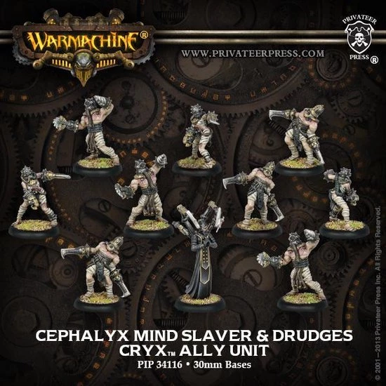 From below western Immoren emerge the inscrutable cephalyx mind slavers, who have entered into an unholy bargain with the Cryxian Empire. Applying a horrific blend of machinery, alchemy, and disfiguring surgery, the slavers transform their captured victims into powerfully muscled and mechanically enhanced warriors they control to fight and die in their stead.