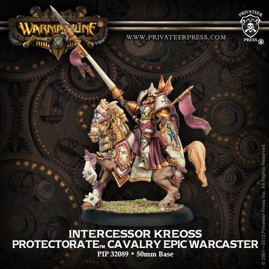 Bestowed the ancient title of Intercessor reserved for the faith’s greatest champion, Mikael Kreoss has complete authority over the Protectorate’s armies and speaks with the voice of Hierarch Severius himself. Intercessor Kreoss leads his men from atop his great steed alongside a vanguard of his Exemplar venger brothers. Bearing his spear Conviction, Kreoss acts as Menoth’s rightful judgment made manifest upon the world.