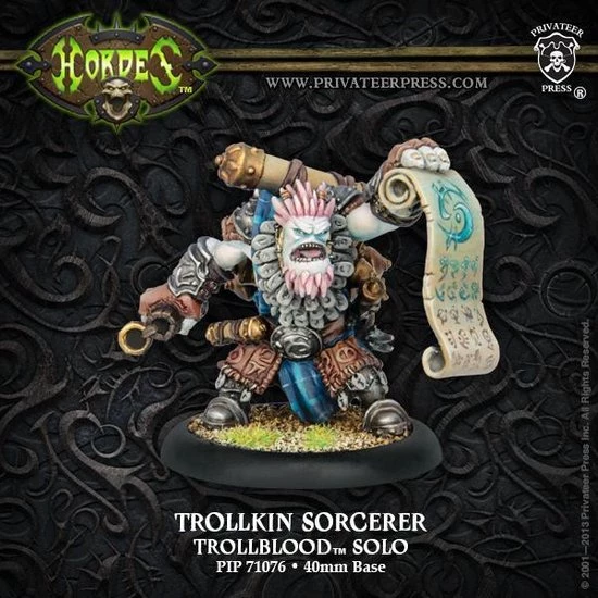 The sorcerers of the trollkin are not timid lore masters but determined and lethal combatants. Typically born with the white skin and red eyes of albinos, making them easily recognized as trollkin sorcerers at birth, they often command powers associated with elements prevalent in the region of their birth. Thus, many originating from the north command the cold winds of winter as a powerful weapon that can be used to attack or defend.