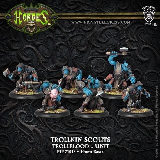 Trollkin Scouts stand out as rugged and resourceful in a race known for their ability to endure. These nomadic Trollkin are skilled hunters who live off the land in tight-knit communities, on the outer edges of trollkin society. They are peerless woodsmen capable of stealthily burying an axe in an enemy within the densest of forests or charging forth with a battle cry and a barrage of thrown hunting axes. When the kriels can entice their isolated cousins to join them, they gain superb hunters who excel at irregular warfare.