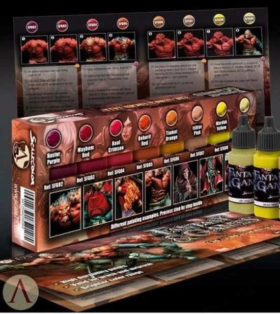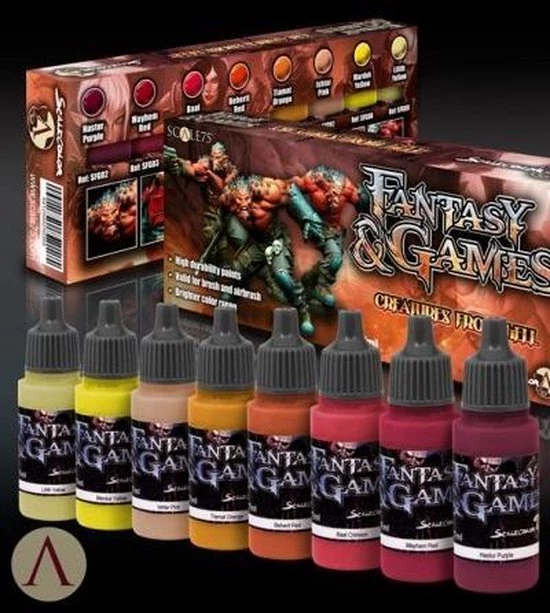 Scale75 Fantasy and Games – Creatures from Hell bevat 8 potjes voornamelijk rood en geeltinten Scalecolor Fantasy & Games acrylverf van 17ml. Deze verf kan zowel met het penseel als met de airbrush verwerkt worden en heeft een goede dekkracht en vloeit prettig. Scale75 Fantasy & Games paint, De formule van de Fantasy & Games verven is anders dan de originele Scalecolor. De kleuren zijn helderder en de consistentie steviger voor gaming gebruik maar is ook dunner, waardoor het blenden van de kleuren wat makkelijker gaat. Daarnaast droogt deze verf niet zo ultramat op als de originele Scalecolor verf waardoor de heldere kleuren nog helderder overkomen. De Scale75 Fantasy and Games – Creatures from Hell bevat de volgende kleuren: Hastur Purple, Mayhem Red, Baal Crimson, Beherit Red, Tiamat Orange, Ishtar Pink, Marduk Yellow, Lilith Yellow