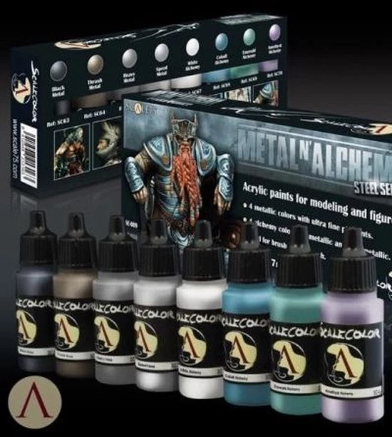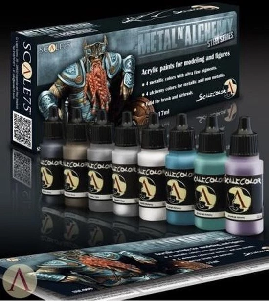Scale 75 Metal’n Alchemy – Steel metallic paint set bevat 8 potjes Scalecolor acrylverf van 17ml. Deze verf kan zowel met het penseel als met de airbrush verwerkt worden en heeft een goede dekkracht en vloeit prettig. Lees hier een interessante review (mét afbeeldingen) over deze set.