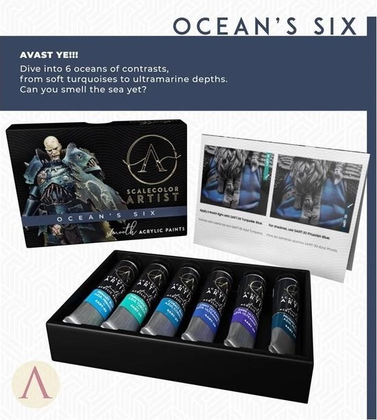 Ocean’s Six, avast ye !!!! Duik in 6 blauwe oceanen van contrasten, van zachte turkooizen tot ultramarijn diepten. Kun je de zee al ruiken? De ScaleColor Artist-reeks is geïnspireerd op het palet van de beeldend kunstenaar. Verschillende kleuren zijn ontworpen om alle soorten miniaturen te schilderen, van historisch tot fantasie. Deze extra fijne, romige pigmentverf die in een tube wordt bewaard, is veerkrachtiger en heeft een grotere intensiteit. Het heeft een grote dekking, eenvoudige toepassing en controle, evenals een hoge veelzijdigheid zowel met penseel als airbrush. Dit alles maakt het een uniek product met een uitstekende afwerking. Deze Ocean’s Six-set bevat de volgende 6×20 ml acrylverftubes. SART-03 – Primary Blue, SART-26 – Turquoise Blue, SART-27 – Cobalt Blue, SART-28 – Light Ultramarine, SART-29 – Dark Ultramarine, SART-30 – Prussian Blue
