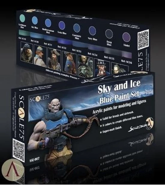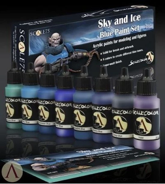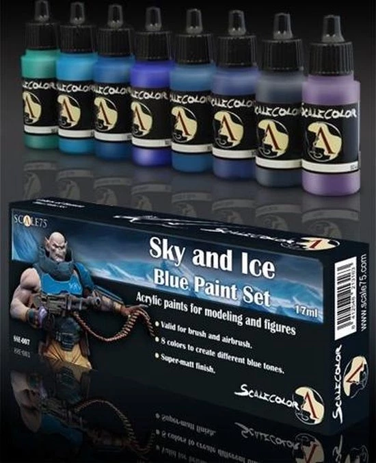 Scale75 Sky and Ice – Blue Paint Set bevat 8 potjes Scalecolor acrylverf van 17ml. Deze verf kan zowel met het penseel als met de airbrush verwerkt worden en heeft een goede dekkracht en vloeit prettig. De Scale75 Sky and Ice Blue Paint Set bevat de volgende kleuren: Caribbean Blue, Sky Blue, Mediterranean Blue, Tesla Blue, Cantabric Blue, Navy Blue, Deep Blue, Violet