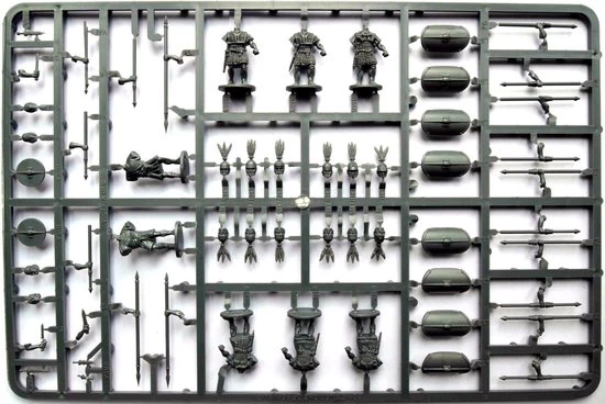 The set contains 36 legionaries which can be Hastati or Princeps armed with pilum, or you can make some as Triari by arming them with the long spear. There are 3 Centurions, 3 standard bearers and options to make 3 musicians. Also included are 18 light infantry which can be made as Velites after 211BCE or theearlier skirmisher Leves lightly armed with javelins but no shield or helmet.