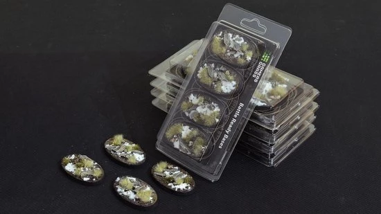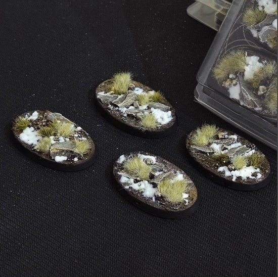 This pack contains 4 oval Battle Ready Bases 60mm wide in a Winter theme.