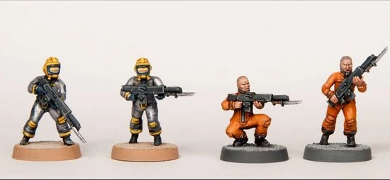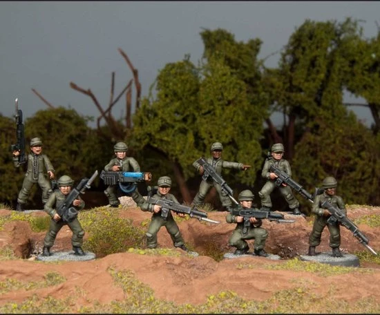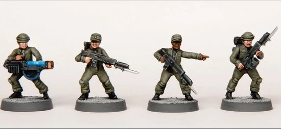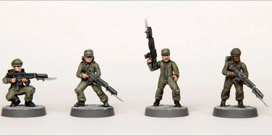 This box set includes enough parts to build 30 hard plastic troops with standard rifles and plasma weapons along with grenades, pistols, backpacks, and other accessories to customize your force. Four different head types allow for very different looks for your team. Alternatively you can use them for planetary or near future militia, escaped prisoners, starship crew, and more.