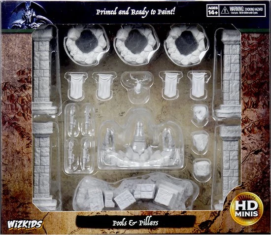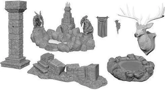 Dit is een landschapspakket met 4 staande pilaren, 4 fakkelaccessoires, 4 banneraccessoires, 3 kleine pools, 1 opgezette hertenkopaccessoire, 1 gevallen pilaar en 1 grote pool.