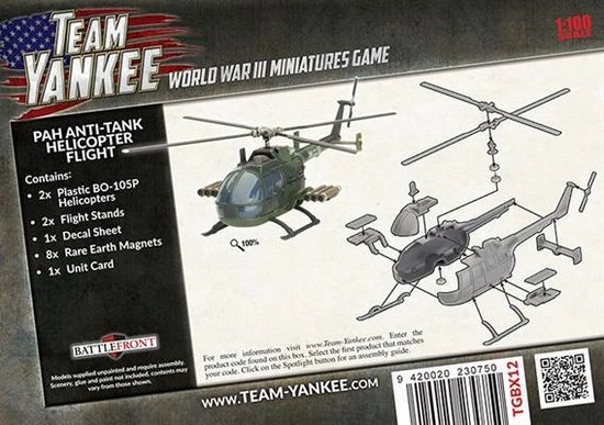 Includes two plastic BO-105 PAH anti-tank helicopters, two plastic flight stands, decal sheet, eight rare-earth magnets & Unit Card.